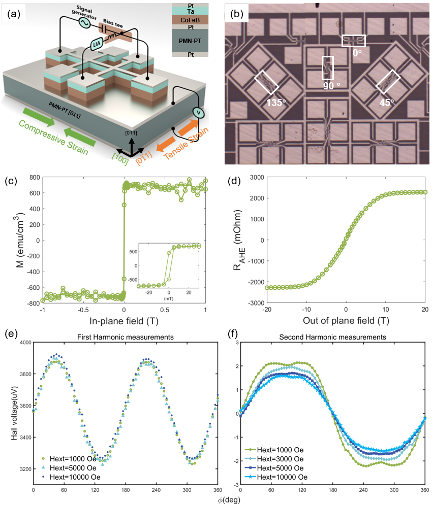 Hong Jeongmin教授团队以“An energy efficient way for quantitative magnetization switching”为标题发表的论文重点探索了电控自旋器件铁电 (FE) 和铁磁 (FM) 材料中电控磁化开关特性,并在高能效自旋存储器和逻辑器件中开展了应用研究。文中研究了压电衬底上的自旋轨道转矩效应的角度依赖性,利用基底上的电场控制局部面内应变,实现受控应变通过多铁氧体异质结构中的 SOT效应对磁化切换进行定量调制。通过谐波霍尔测量、XMCD-PEEM、XRD、VSM、MFM和微磁仿真模拟,来揭示电场对磁化开关行为的可控性。
